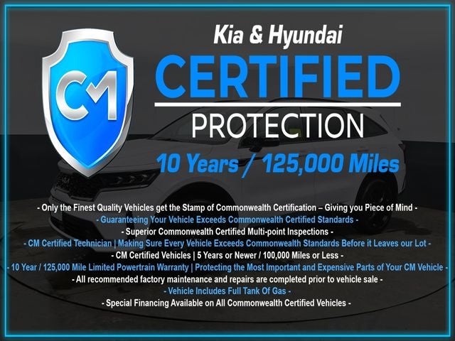 Certification Program Details: CM Kia Certified with powertrain coverage up to 10 years and 125,000 miles. Vehicle is Covered by the CM Certified Protection 10 year and 125,000-mile limited powertrain warranty. Warranty coverage is available across all 50 states. • Vehicle must pass a strict 162-point Factory Directed inspection • Vehicles include a Carfax history Report • All recommended factory maintenance and repairs completed prior to vehicle sale • Vehicle includes a full cosmetic reconditioning and interior renewal • Full tank of gas • Rental and Tow assistance for qualified repairs