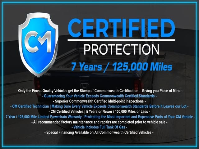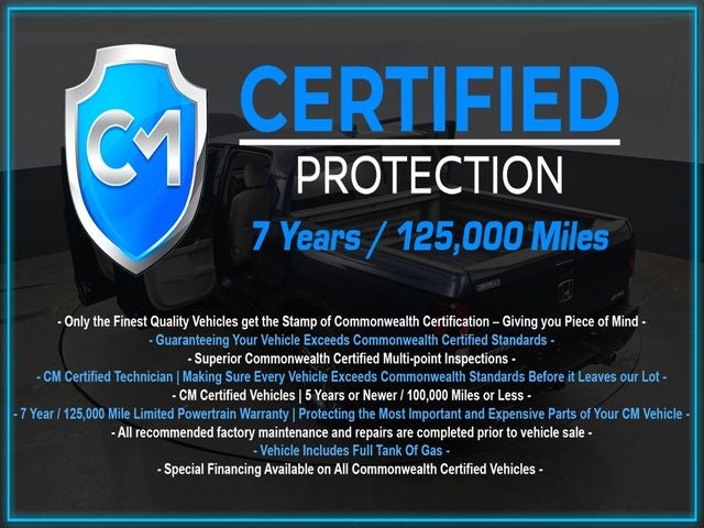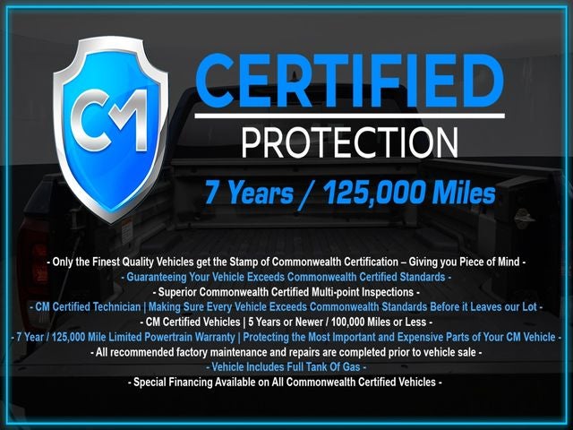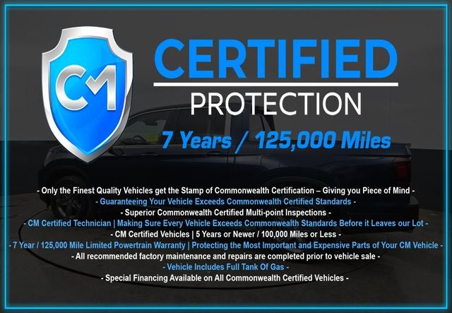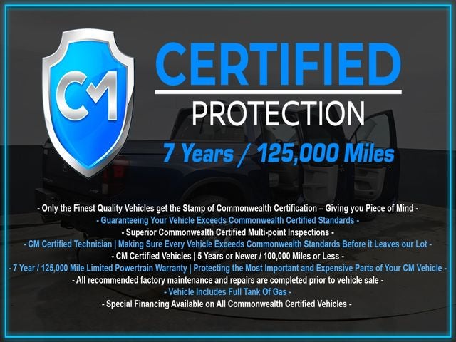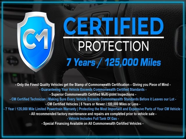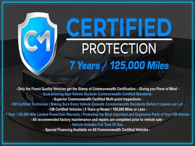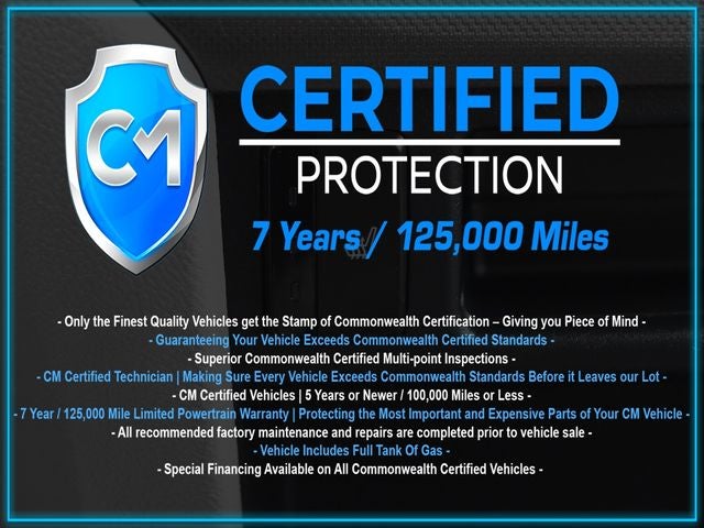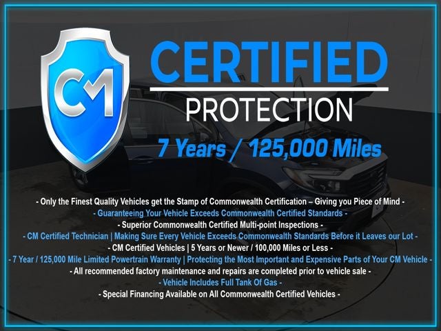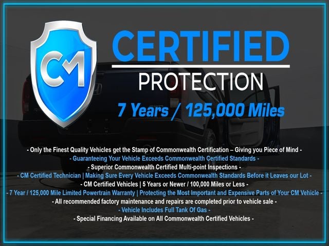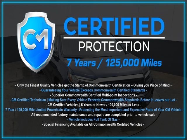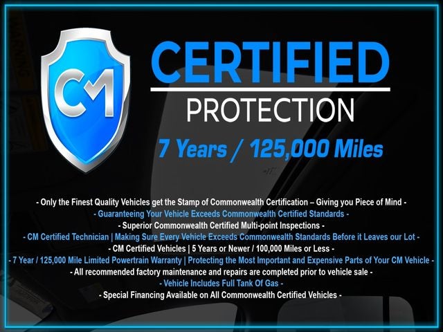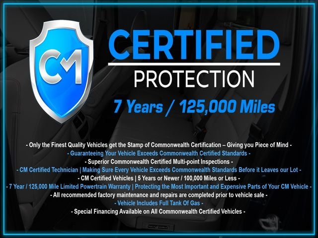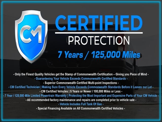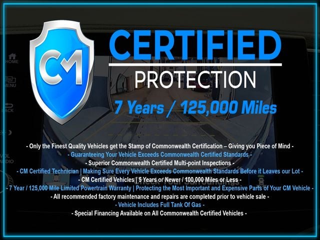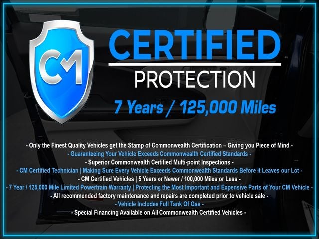 Certification Program Details: CM Certified with powertrain coverage up to 7 years and 125,000 miles. Vehicle is Covered by the CM Certified Protection 7 year and 125,000-mile limited powertrain warranty. Warranty coverage is available across all 50 states. • Vehicle must pass a strict 162-point Factory Directed inspection • Vehicles include a Carfax history Report • All recommended factory maintenance and repairs completed prior to vehicle sale • Vehicle includes a full cosmetic reconditioning and interior renewal • Full tank of gas • Rental and Tow assistance for qualified repairs