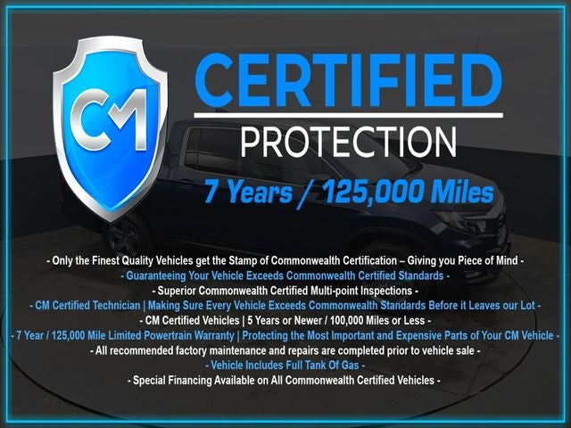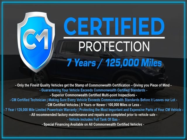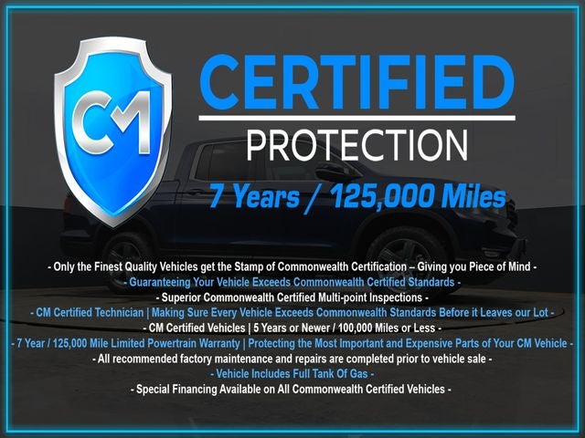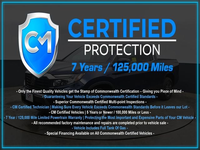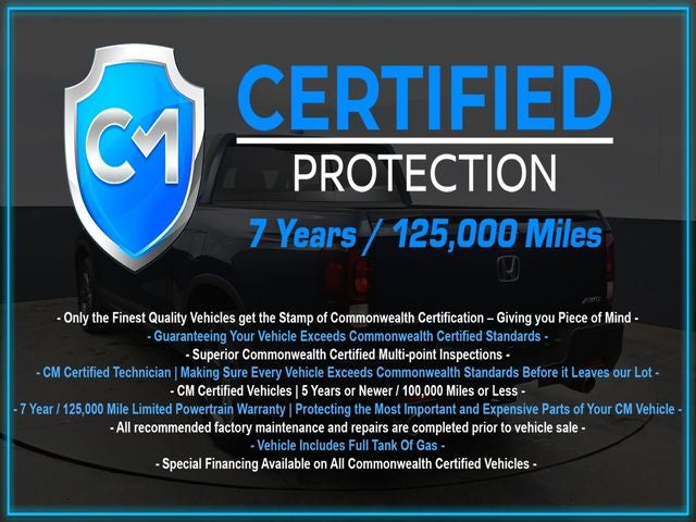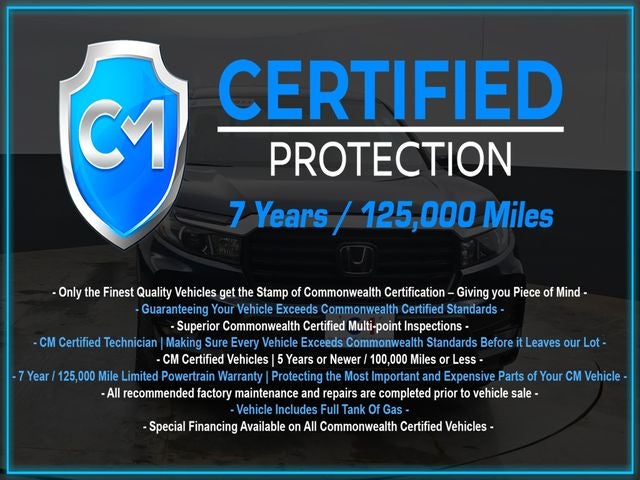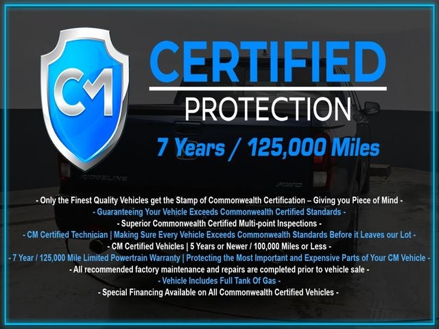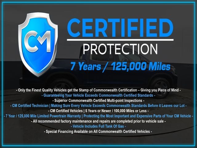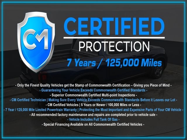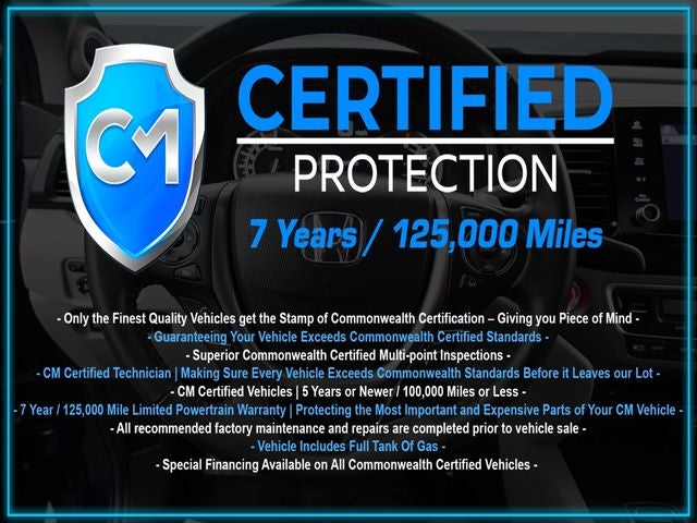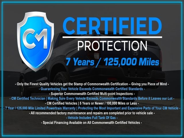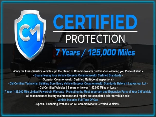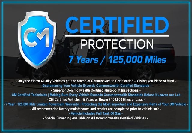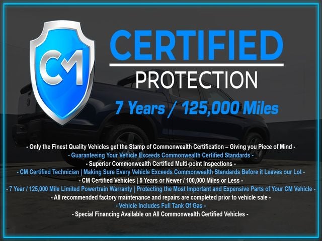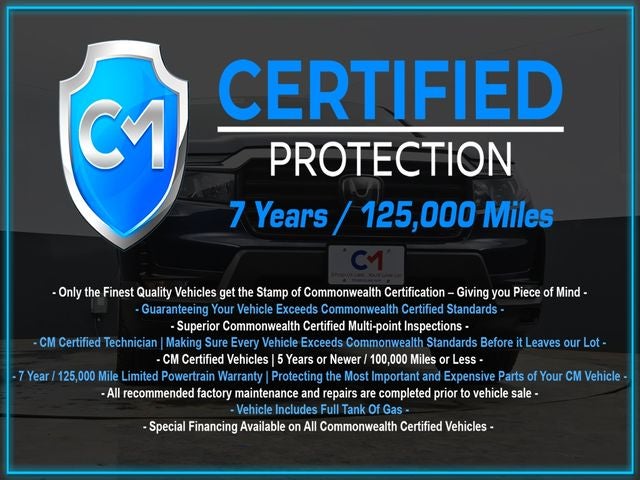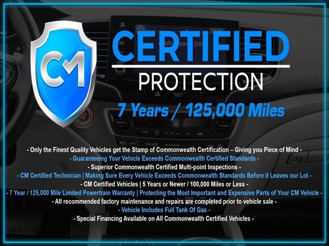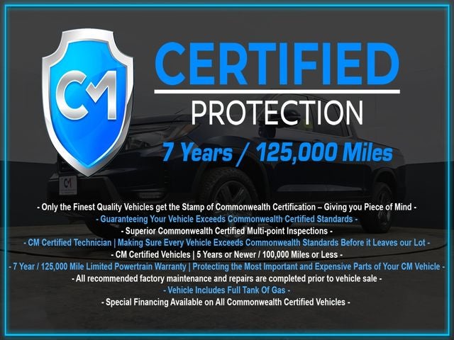 Certification Program Details: CM Certified with powertrain coverage up to 7 years and 125,000 miles. Vehicle is Covered by the CM Certified Protection 7 year and 125,000-mile limited powertrain warranty. Warranty coverage is available across all 50 states. • Vehicle must pass a strict 162-point Factory Directed inspection • Vehicles include a Carfax history Report • All recommended factory maintenance and repairs completed prior to vehicle sale • Vehicle includes a full cosmetic reconditioning and interior renewal • Full tank of gas • Rental and Tow assistance for qualified repairs