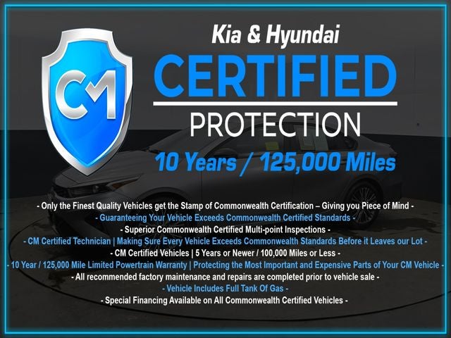 Certification Program Details: CM Kia Certified with powertrain coverage up to 10 years and 125,000 miles. Vehicle is Covered by the CM Certified Protection 10 year and 125,000-mile limited powertrain warranty. Warranty coverage is available across all 50 states. • Vehicle must pass a strict 162-point Factory Directed inspection • Vehicles include a Carfax history Report • All recommended factory maintenance and repairs completed prior to vehicle sale • Vehicle includes a full cosmetic reconditioning and interior renewal • Full tank of gas • Rental and Tow assistance for qualified repairs